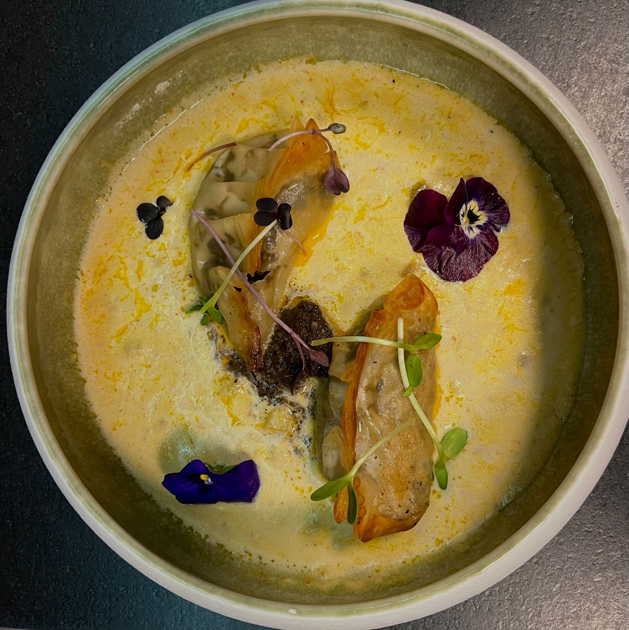 La délicatesse du Ravioli maison à la Pintade et aux morilles. Sauce au foie gras.